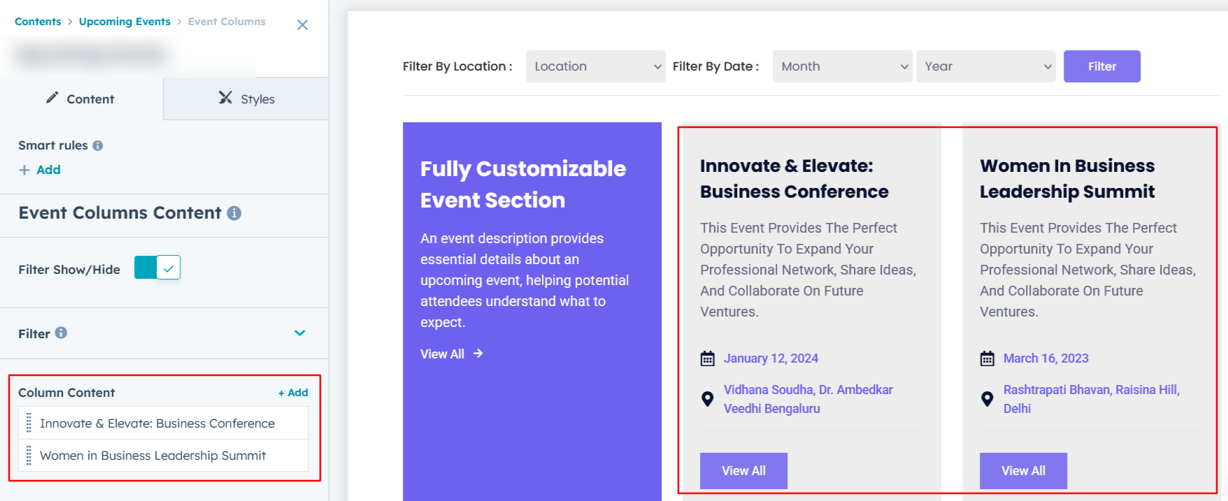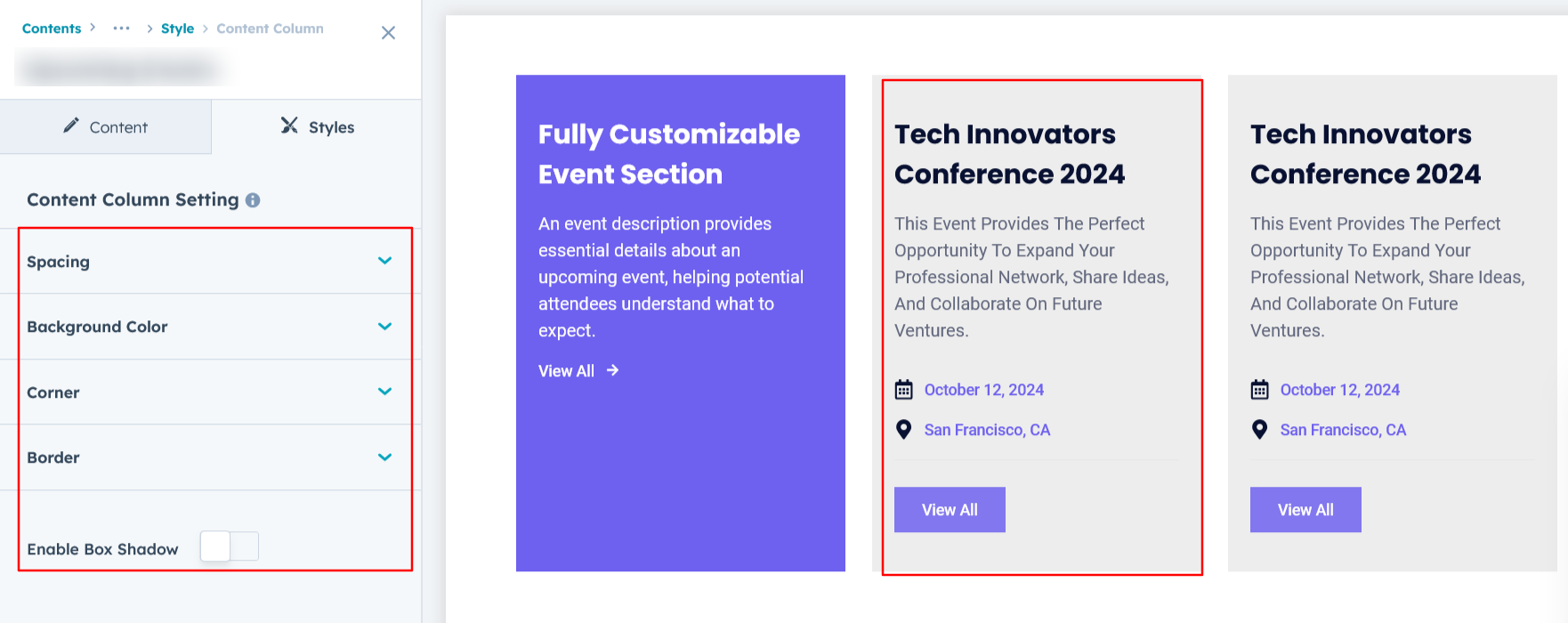 Users can easily customize the Event Column Spacing for both desktop and mobile views. You can also adjust the Background Color, set the Border and Border Radius, and apply a Box Shadow for added depth and visual appeal.