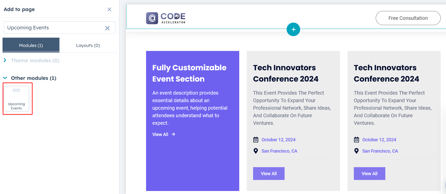 We hope you enjoy using our upcoming events module to create a seamless experience for both your users and your marketing team. At Code Accelerator, we're committed to ensuring your HubSpot experience is exceptional. If you need a custom HubSpot module or require a tailored HubSpot CMS or CRM setup, please don’t hesitate to Contact Us.