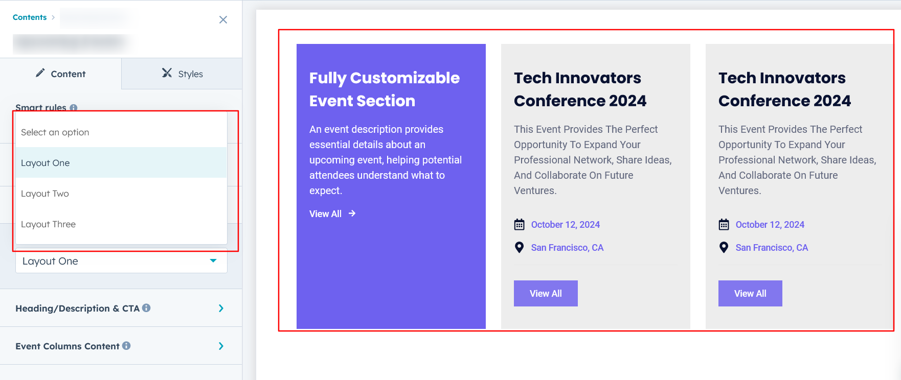For Upcoming Events, select your preferred layout (e.g., Layout 1, Layout 2, or Layout 3). You can easily rearrange the event cards within the chosen layout to create the ideal content flow and visual arrangement.