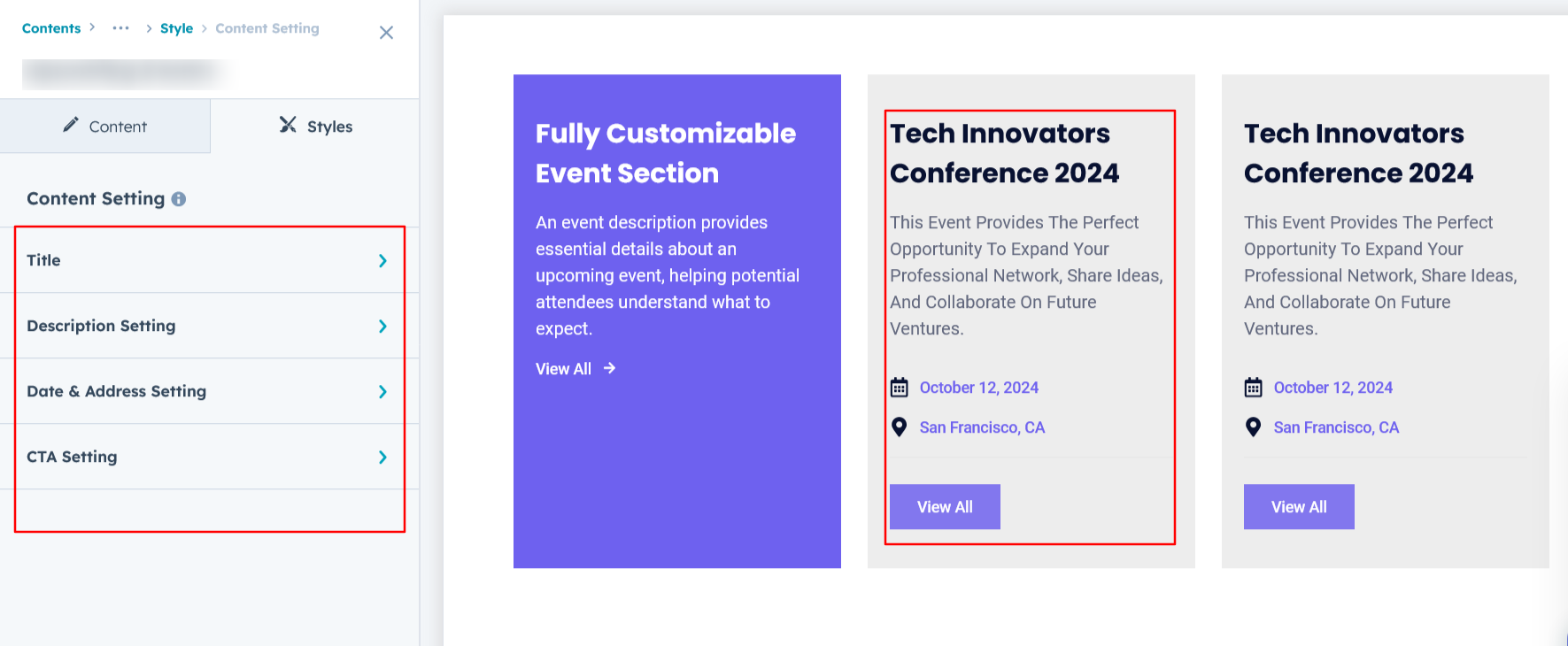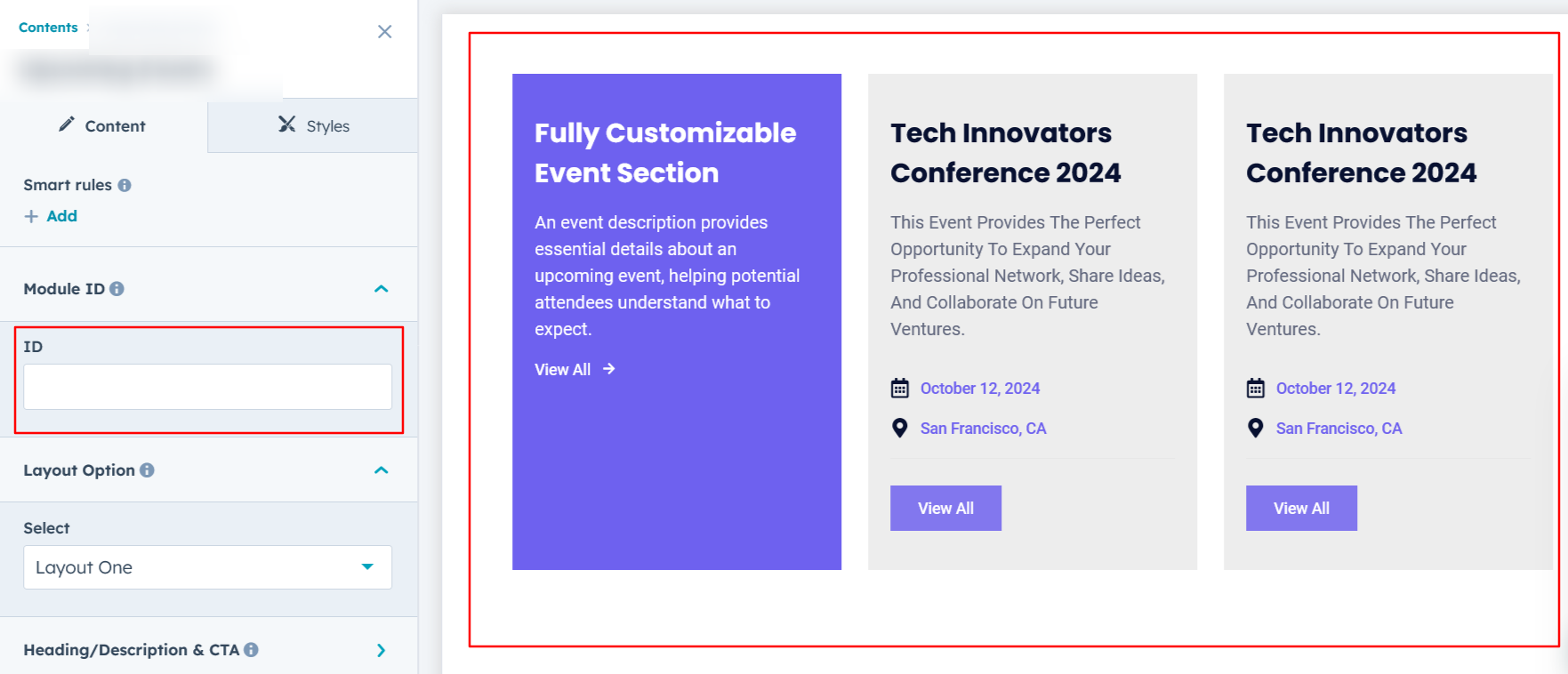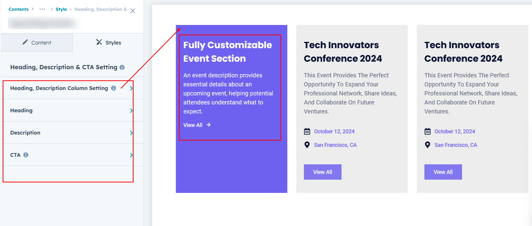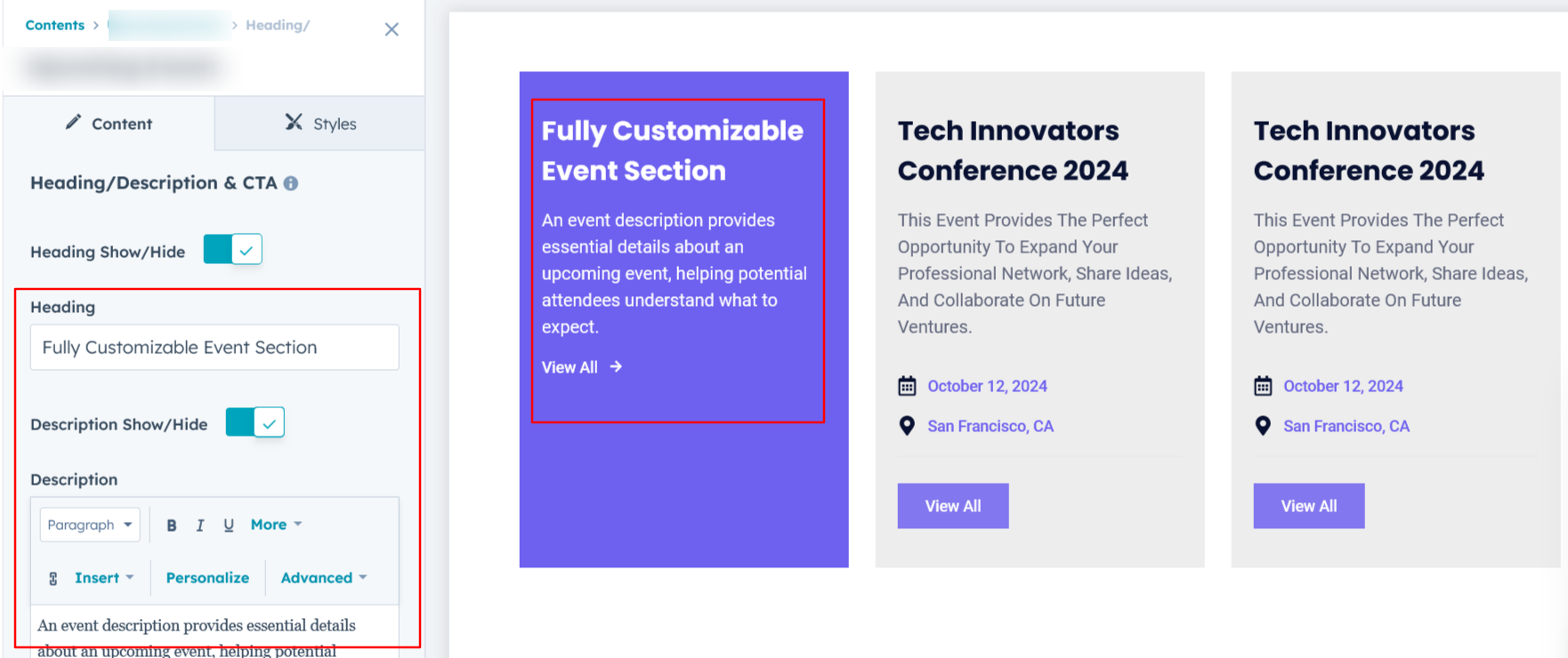 Easily customize the content in your module by modifying the "Heading," "Description," and call-to-action (CTA) to suit your needs. You can also choose to hide the section if desired, giving you complete control over the presentation and functionality of your content.