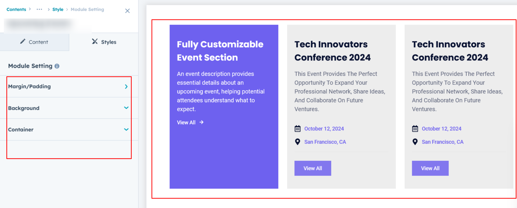 Adjust the margins, padding, background colors, and container width to achieve your desired look and feel for the module. This flexibility allows you to fine-tune the layout and aesthetics, ensuring that your design is not only visually appealing but also functional and user-friendly.