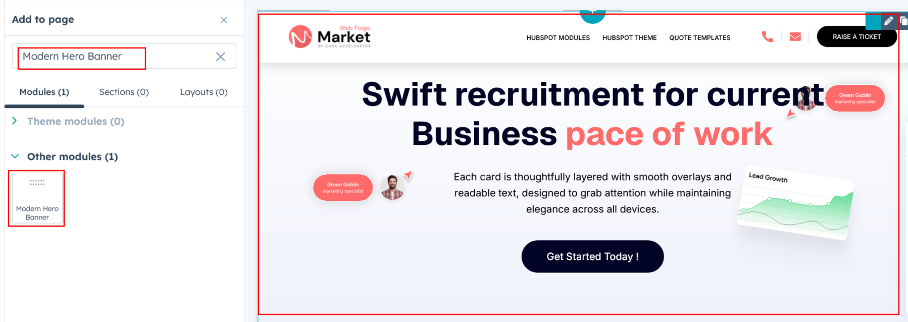 Search for "Modern Hero Banner" and drag and drop the module into the desired location on your page.