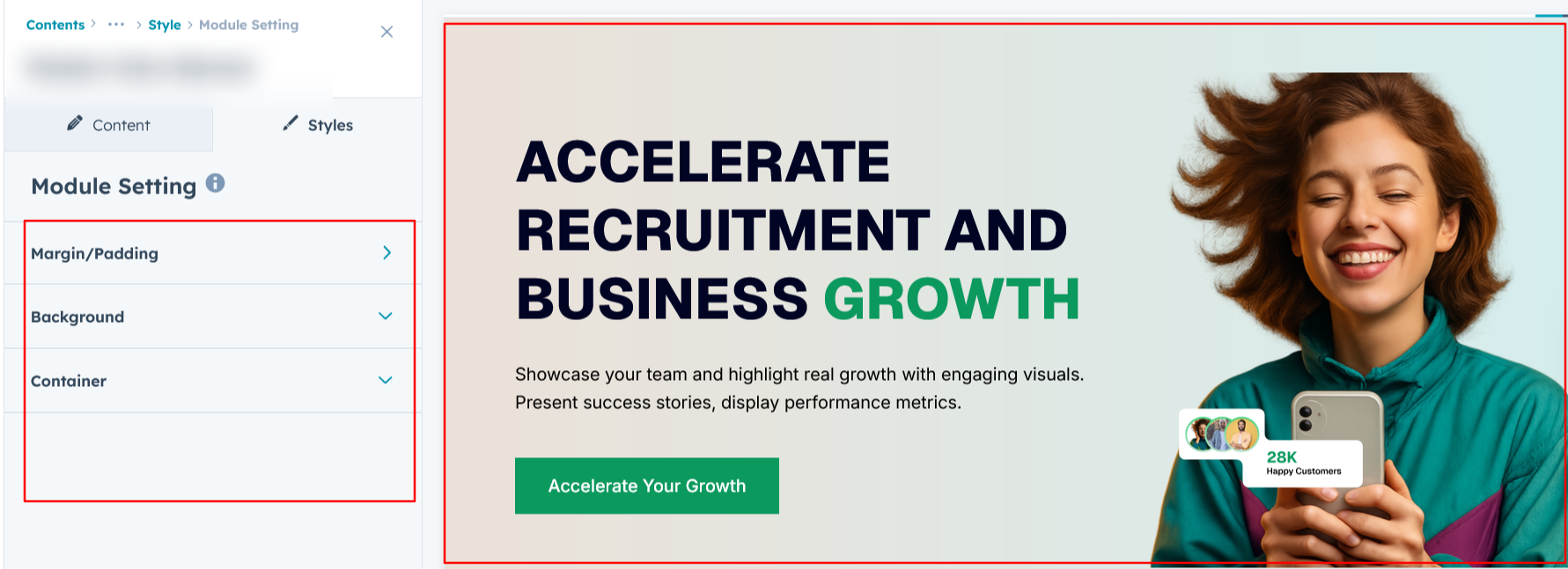Adjust the margin, padding, container width and background colors to achieve your desired look and feel for the module. This flexibility lets you fine-tune the layout and aesthetics, ensuring your design is both visually appealing and user-friendly.